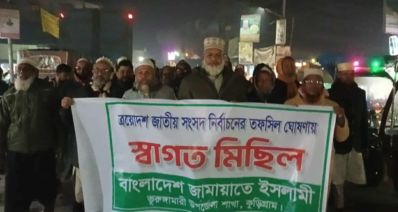 কুড়িগ্রামের ভূরুঙ্গামারীতে ত্রয়োদশ জাতীয় সংসদ নির্বাচনের তফসিল ঘোষণাকে স্বাগত জানিয়ে আনন্দ মিছিল করেছে উপজেলা জামায়াতে ইসলামী। বৃহস্পতিবার (১১ ডিসেম্বর) রাত