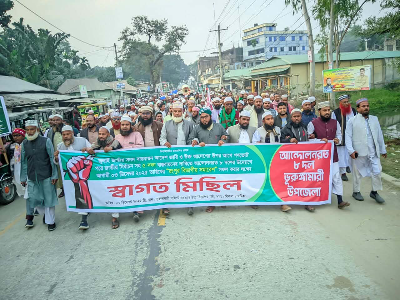 জুলাই সনদ বাস্তবায়ন, গণভোট ও পিআর নির্বাচন দাবিতে ভূরুঙ্গামারীতে ইসলামী ৮ দলের স্বাগত মিছিল-সমাবেশ