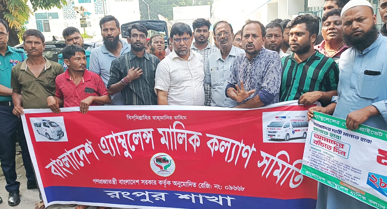 জরুরি সেবার স্বীকৃতি ও হয়রানি বন্ধের দাবি: রংপুরে বাংলাদেশ অ্যাম্বুলেন্স মালিক কল্যাণ সমিতির উদ্যোগে মানববন্ধন অনুষ্ঠিত, ৭/৫ দফা দাবি বাস্তবায়নের জন্য সরকারের প্রতি আহ্বান
